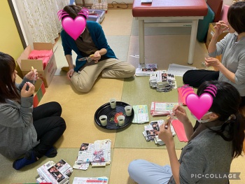 写真は先日スタッフのみんなで「さぎおかだより」を封筒詰めしていた時の休憩時の様子です。
