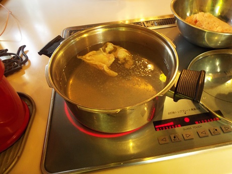 1.鍋に多めの水と胸肉の皮を入れ、弱火で煮込む